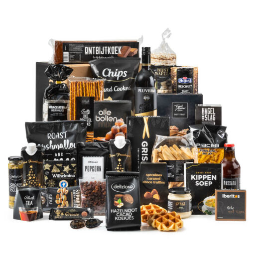 Met recht heeft dit pakket de naam Zwart XL gekregen. Het is een enorm familie kerstpakket met maar liefst 35 artikelen; voor ieder wat wils. Te beginnen met een fles Spaanse rode wijn, chips, nootjes, pretzels, toast, paté en nog meer hartige snacks. Ook aan de mensen die van zoetigheid houden is gedacht, zoals koekjes, chocolade, suikerwafels en pepermunt. Het is teveel om op te noemen, kijk zelf maar en geniet ervan!
